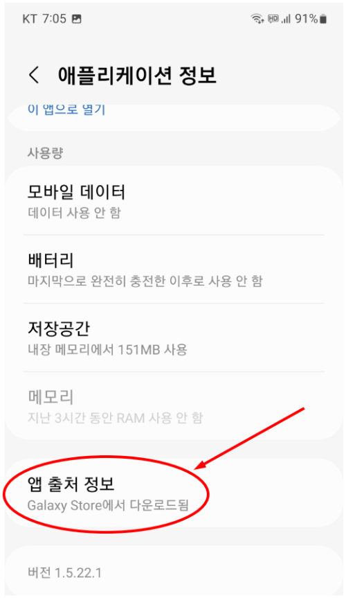 위 그림과 같이 '앱 출처 정보'에 다운로드된 출처가 '원스토어', '갤럭시스토어', '플레이스토어' 등과 같이 검증된 앱 스토어인 경우에는 일단 해킹용 앱이 아닐 가능성이 높습니다. 그렇지 않고, 출처 정보 자체가 아예 없다면 해킹용 앱일 가능성이 매우 높습니다. (단, 제조사나 통신사 출하 시에 최초부터 설치된 앱인 경우에 출처 정보에 앱스토어가 기재되지 않을 가능성도 있습니다.)
