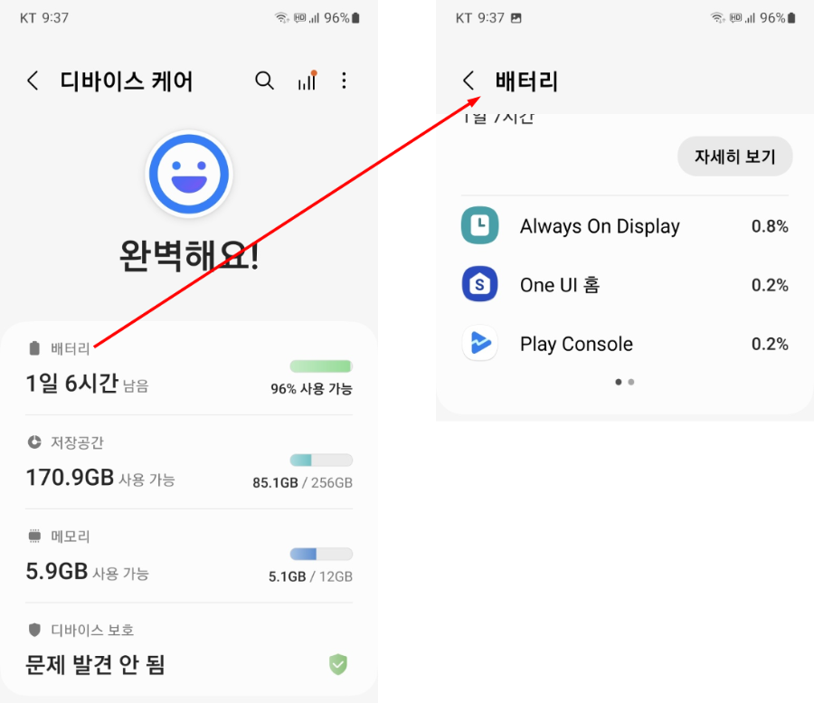 이러한 상황을 감안하더라도 스마트폰의 배터리가 더 자주 빨리 소진된다고 판단이 된다면, 설정→배터리 및 디바이스 케어→배터리 메뉴에서 배터리를 비정상적으로 많이 사용하는 앱이 있는지 확인합니다. (아래는 갤럭시 폰의 경우 확인 방법)