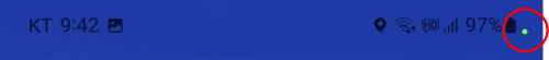 당신이 지금 스마트폰에서 아무런 앱(어플)도 실행시키지 않았는데도 아래 그림의 붉은색 원 내부와 같이 휴대폰 상단바 (상태표시줄)의 맨 오른쪽에 녹색 또는 청록색의 작은 원이 표시되어 있다면, 당신도 모르게 스마트폰의 카메라 또는 마이크가 작동 중일 가능성이 매우 높습니다.