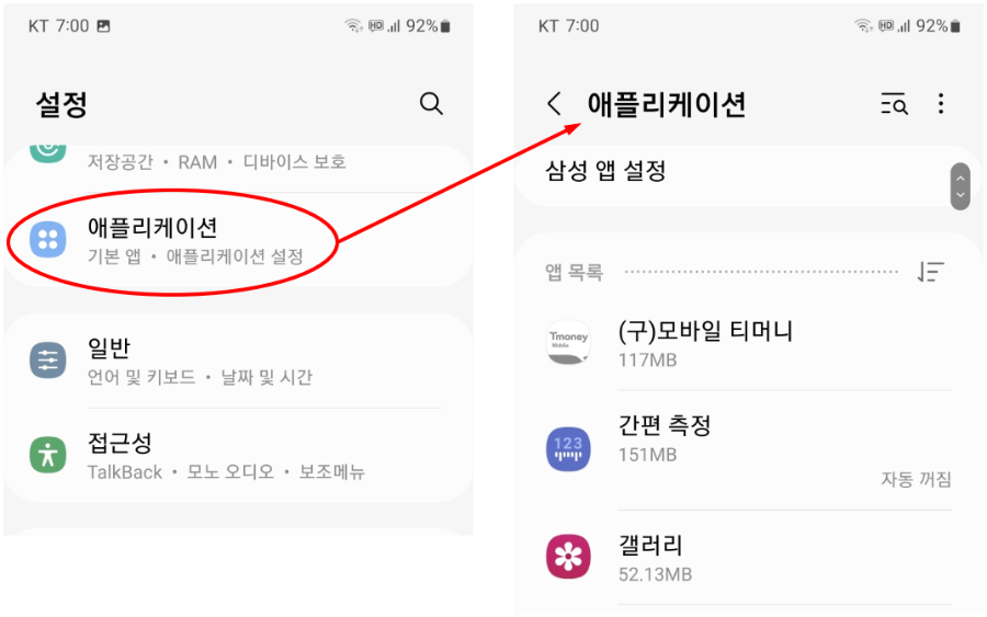 스마트폰 화면에서 살펴보지 마시고 반드시 아래와 같이 스마트폰의 '설정' 메뉴에서 '애플리케이션'을 선택하신 후에 나열되는 앱을 천천히 하나하나 잘 살펴보시기 바랍니다.