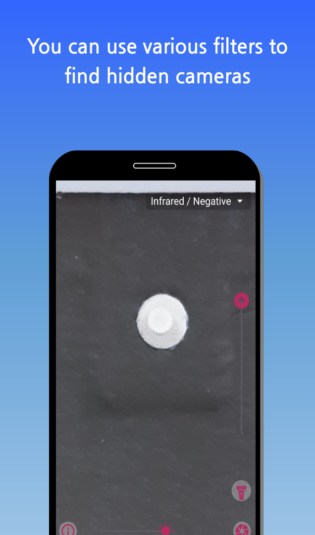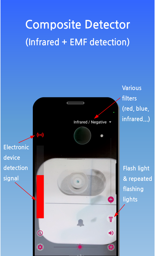This is when the app discerns a hidden camera lens using negative/ultra red filter function in the smartphone camera. Negative/ ultra-red filter helps greatly to discern images normally won’t show up with naked eye.