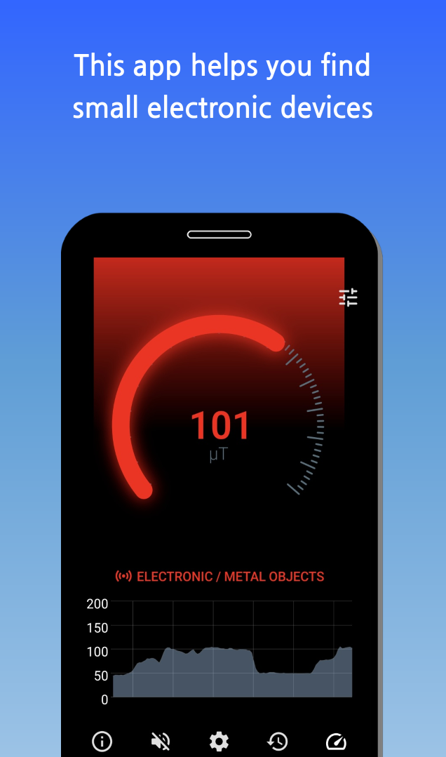 Select Electronic device detector on the menu while scanning a suspicious wall, hole, alarm, furniture, interior. An alarm will be heard and warning sign will pop up when the app detects unexpected device or a metal object.